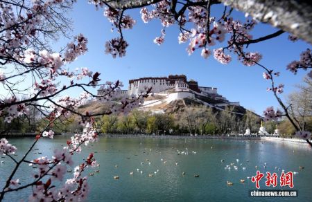 4月2日,布达拉宫脚下的紫叶李绽放。随着气温回暖,西藏拉萨布达拉宫脚下春花绽放、柳叶吐绿,与古老宫墙相互映衬,构成一幅独具高原特色的春日画卷。(