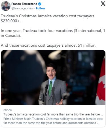 此外,加拿大纳税人联合会联邦主任Franco Terrazzano在推特上表示,总理在一年时间内四次度假——其中两次前往牙买加,去年八月去了BC省的Tofino,以及去年四月份前往Montana。“这已经让纳税人花费了超过90万加元。”