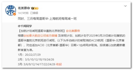 另据航空博主@北美票帝和@千阅同学披露,加航计划于2025年3月29日前计划复航的温哥华直航北京航班减少班次,三月每周温哥华-上海航班每周减一班。这和早前宣布的1月15日起每周往返7趟都有所减少。已经有网友证实收到了取消的通知。