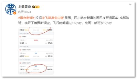 目前飞行时间增加的有四川航空:四川航空新增的周四夜班温哥华-成都航班,绕开了俄罗斯领空,飞行时间超过15小时,比周二航班长3小时。另外12月3日起新增的北京-温哥华CA991/992航班,已经执行了三班。根据@飞常准业内版 显示,这三个航班均绕开了俄罗斯领空。温哥华-北京的飞行时间预计增加2小时左右。