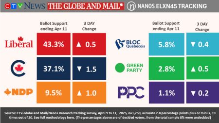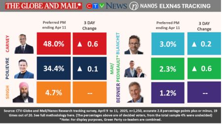 在加拿大联邦大选进入第21天之际,自由党继续保持领先优势。根据 Nanos Research于4月11日发布的最新三日滚动民调,自由党在全国支持率为43%,领先保守党的37%,领先幅度维持在6个百分点。卡尼和博励治分别面临加拿大联邦大选不同的考验