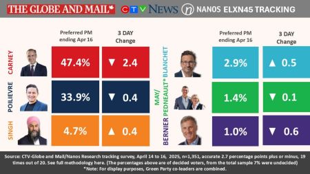 值得一提的是,绿党领袖Jonathan Pedneault未能参与两场辩论。辩论委员会在周三早些时候撤回了对绿党的邀请。目前,联邦大选进入第26天,在36天的竞选周期中,自由党仍以微弱优势领先。根据Nanos Research截至4月16日的三日滚动民调,自由党全国支持率为44%,领先保守党的39%,差距为5个百分点。