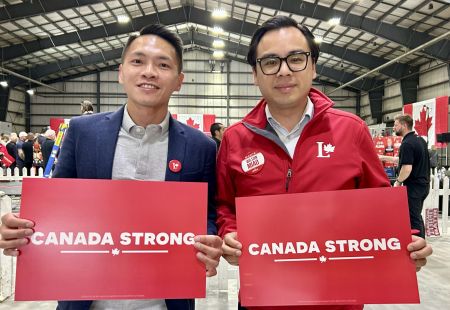 在全国关注的BC选区当中,自由党列治文中一马宝区(Richmond Centre—Marpole)区候选人缪宗晏(Wilson Miao,下图右)将竞逐连任;本拿比中央区(Burnaby Central)候选人张玮麟(Wade Chang,下图左)则是挑战新民主党党领驵勉诚(Jagmeet Singh)。他们在现场以团队姿态亮相,表示自由党一向公开透明,会采取主动向选民说明政纲、民主的可贵以及自由党的价值观,呼吁还没有投票的选民珍惜手上的那一票。