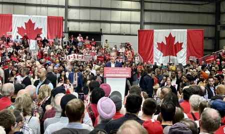 联邦自由党党领卡尼在素里造势大会上讲话。星岛记者黄忆欣摄