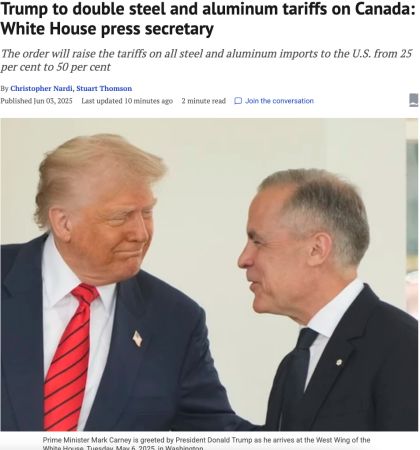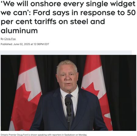 得知特朗普将对铁铝关税翻倍至50%后,安大略省省长道格·福特6月2日誓言将所有东西都搬回加拿大国内做,不必依赖美国。福特周一在萨斯卡通的媒体见面会上发表了上述言论。他原计划出席与加拿大总理马克·卡尼以及各省省长举行的省部级会议。对加拿大进口钢铁和铝的关税将从25%提高到50%。这可能会对加拿大钢铁行业造成毁灭性打击。