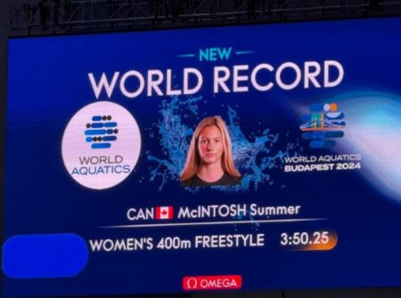 多伦多游泳新星麦金托什(Summer McIntosh) 在加拿大贝尔游泳选拔赛中,以3分54秒18的成绩在女子400米自由泳项目中打破世界纪录。比赛于周六在维多利亚市的英联邦体育馆举行。这项成绩比澳大利亚选手Ariarne Titmus在2023年创下的旧纪录快了1.20秒,麦金托什也因此取得了个人第四项长池世界纪录。