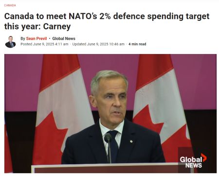 加拿大总理马克·卡尼(Mark Carney)周一(6月9日)宣布,加拿大将在本财年实现北约设定的2%国防支出目标,比原计划提前五年完成。此次宣布是联邦政府扩大国防和安全投资计划的一部分。卡尼在发布会上表示,加拿大将在未来几年加快国防投入,“当涉及到国防——保卫加拿大人、捍卫加拿大利益这种根本性的问题时,我们必须采取行动,这也是我们选择提前行动的原因。”