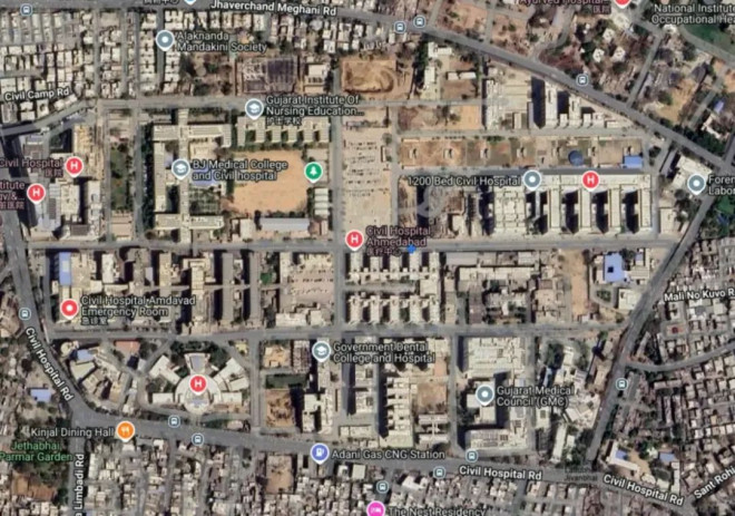 从地面拍摄的视频中出现的楼房形状来看,这架波音787-8坠毁在了距离医院主要建筑很近的位置(紧挨医院大门),可能砸到了医院的辅助建筑,不过应该没有直接砸进医院主楼。