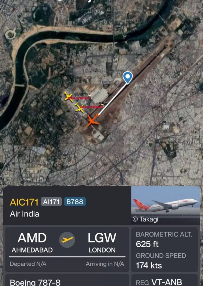 飞机于当地时间13:38(北京时间15:08)起飞,约1分钟后在625英尺(约190米)高度,机组机长喊出Mayday紧急信号,随后便坠入机场附近的Meghani Nagar区。由于洲际航程携带近100吨燃油,坠毁后立刻引发剧烈爆炸和大火。