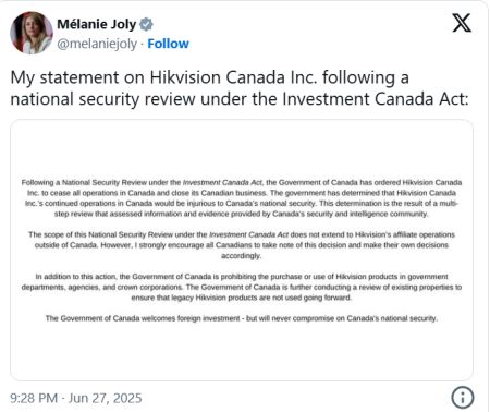 加拿大工业部长乔美兰(Mélanie Joly)周五(6月27日)晚间表示,联邦政府已下令中国监控摄像头制造商海康威视(Hikvision)停止在加拿大运营,理由是国家安全方面的担忧。海康威视,又称杭州海康威视数字技术有限公司,在过去五年半中,因其业务往来及其设备在中国新疆地区的使用而面临美国的多项制裁和限制。人权组织记录了新疆地区对维吾尔族人口和其他穆斯林社区的侵犯行为。