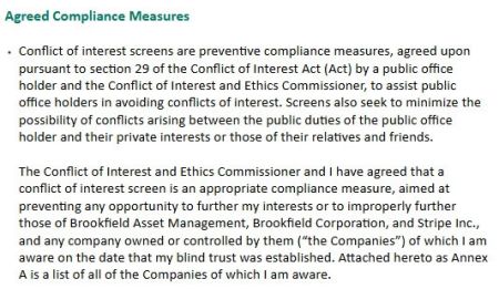 在道德专员网站上公布的披露文件中,卡尼表示,在他设立盲目信托以监管其资产时,他已与该监督机构办公室达成一致,在他本人与布鲁克菲尔德资产管理公司(Brookfield Asset Management)、布鲁克菲尔德公司(Brookfield Corporation)、Stripe Inc. 以及由它们拥有或控制的另外100家公司中的任何一家之间,设立一个利益冲突屏障。
