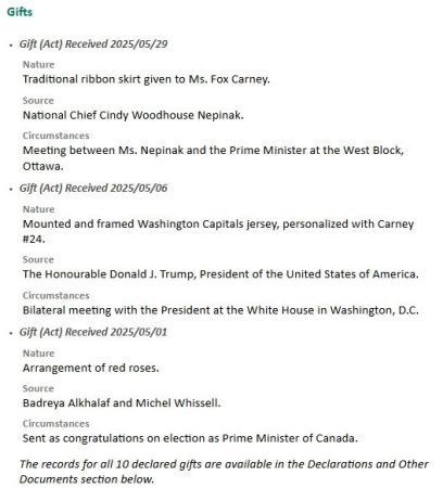 总理曾表示,他唯一没有放入盲目信托的资产是一些现金、一栋度假屋和家庭住宅。除了资产清单外,道德专员还列出了卡尼上任以来收到的、总理需要披露的一些礼物。礼物清单中包括两件冰球球衣。一件是他在3月份参加埃德蒙顿油人队训练时收到的。另一件是他在访问白宫期间,美国总统特朗普赠送的华盛顿首都人队球衣。卡尼还收到了法国总统埃马克龙赠送的一些酒,以及英国首相斯塔默赠送的一个刻有铭文的碗。卡尼在3月份上任后不久访问了这两位领导人。