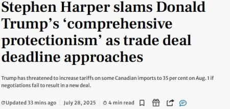 针对加美贸易谈判,加拿大前总理哈珀(Stephen Harper)在最新讲话中指出,一种新的态度正在美国扎根,而且他认为这种态度是错误的。周一(7月28日),在萨斯卡通(Saskatoon)举行的加美关系会议上,这位前保守党领袖将自己描述为可能是加拿大历史上最亲美的总理。但即便如此,他也认为,特朗普追求“全面保护主义”所带来的信任违背,意味着加拿大必须停止在商业和军事上如此严重地依赖美国。哈珀称美国的这种保护主义旨在通过关税从他国攫取经济实力,是“失败的经济政策”。