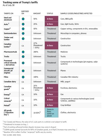 据悉,自重返政坛以来,特朗普已对加拿大实施多项高额关税:钢铁与铝制品50%、汽车25%,其余不涵盖在《美墨加协定》(USMCA)中的商品则一律征收25%关税,仅石油、天然气和钾肥例外,关税为10%。尽管加方在谈判最后的关头,派出了总理的首席助手,但是评论人士指出,这并不能改变谈判僵持的局面。事实上,卡尼和特朗普早前均承认,协议可能无法在周五截止前完成。(具体如下表)