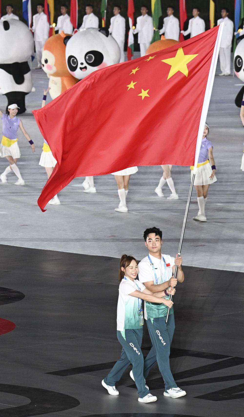 ↑中国体育代表团旗手郭丹(左)和史经纬在开幕式上入场。新华社记者 杜子璇 摄