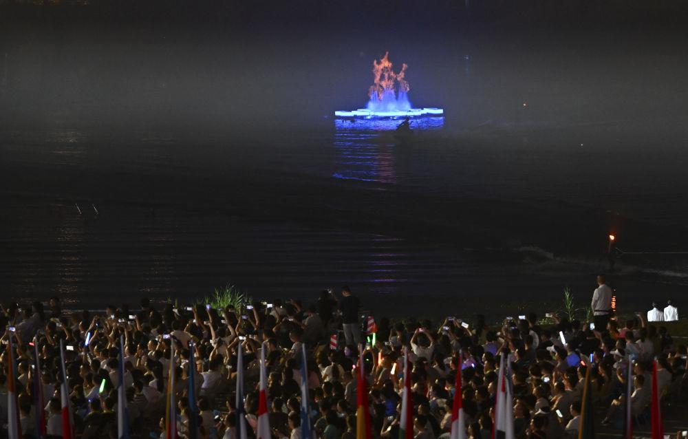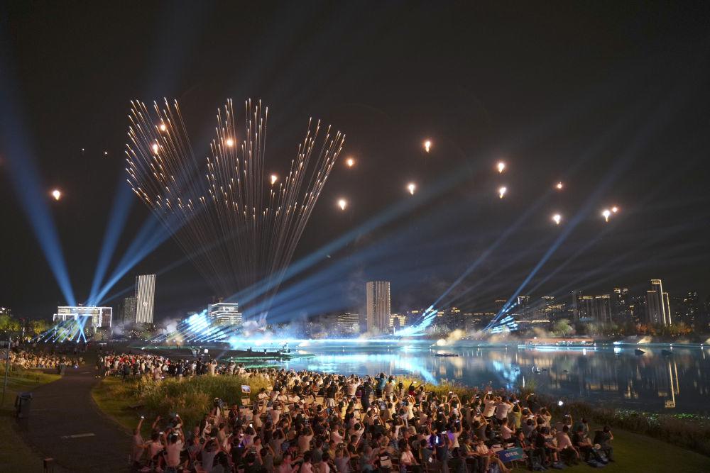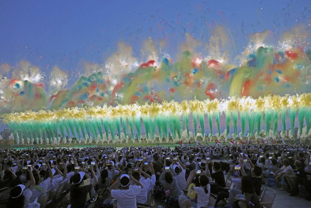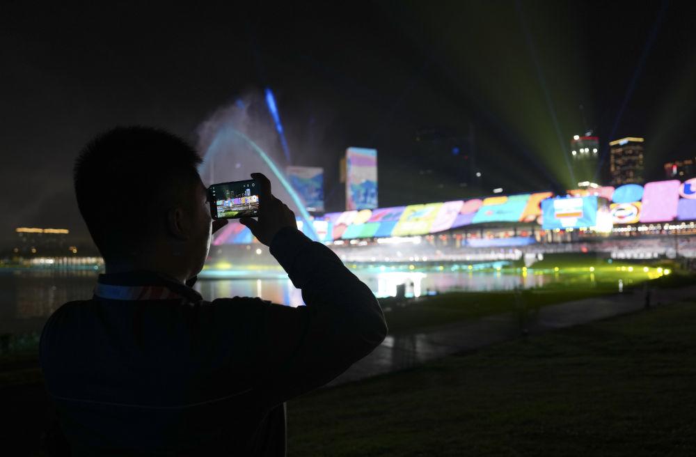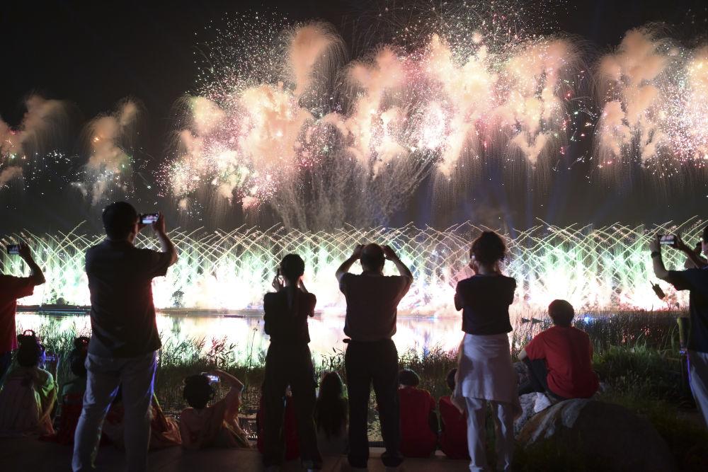 ↑现场观众拍摄开幕式焰火。新华社记者 陈斌 摄