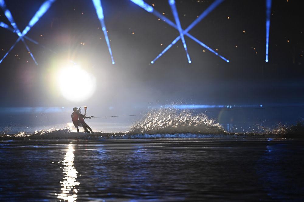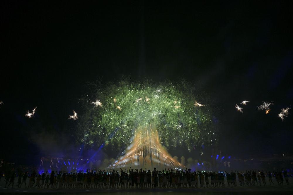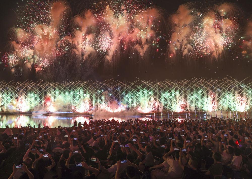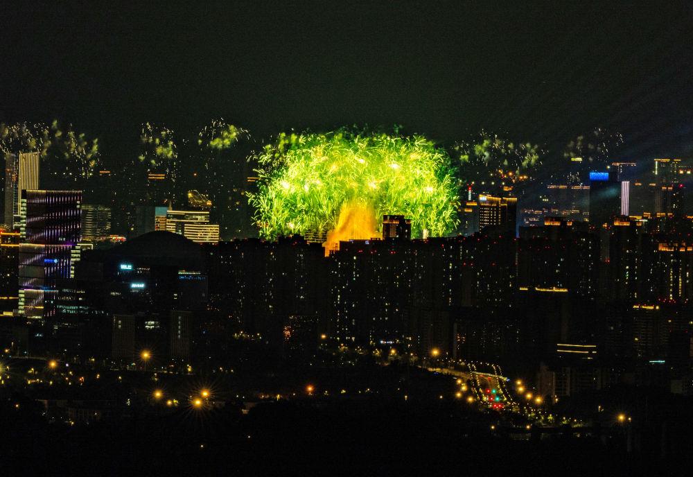 ↑这是8月7日拍摄的开幕式上的焰火表演。新华社记者 陈欣波 摄