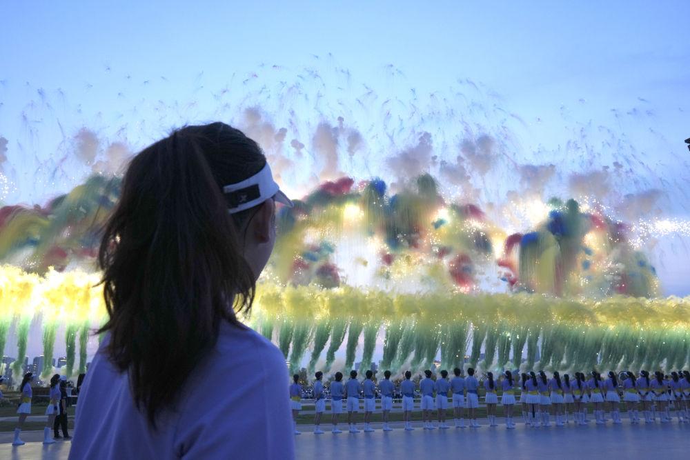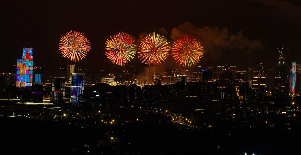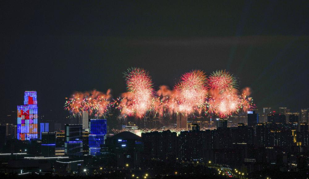 ↑这是开幕式现场燃放的焰火。新华社记者 陈益宸 摄
