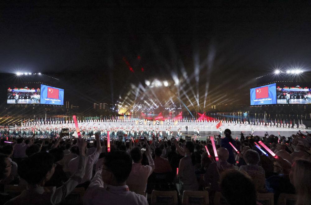 ↑中华人民共和国国旗在开幕式上入场。新华社记者 刘坤 摄