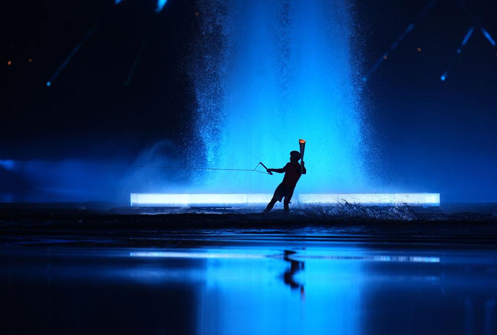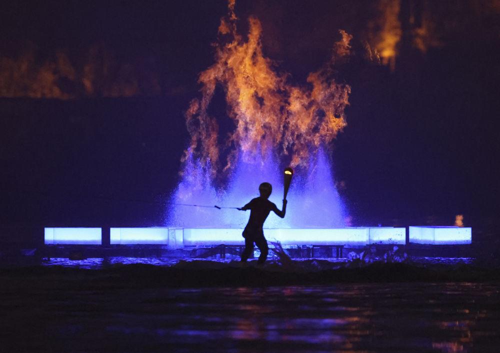 ↑这是开幕式现场的主火炬点燃仪式。新华社记者 贝赫 摄