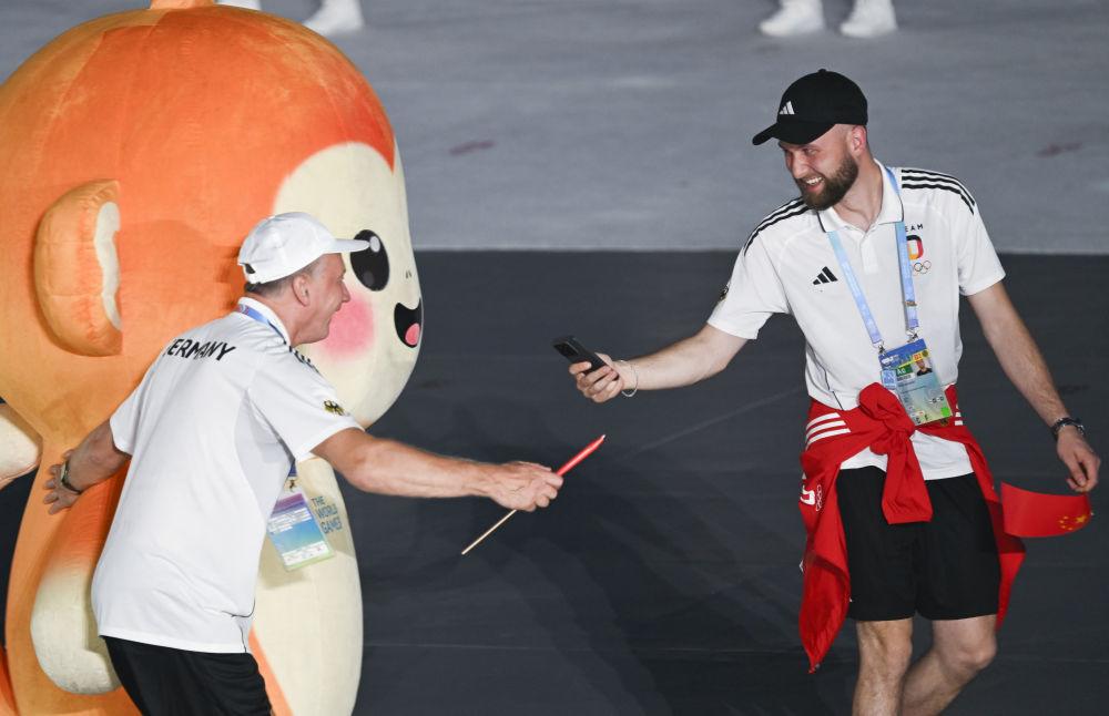↑德国代表团成员在开幕式上与吉祥物“锦仔”互动。 新华社记者 鲍菲菲 摄