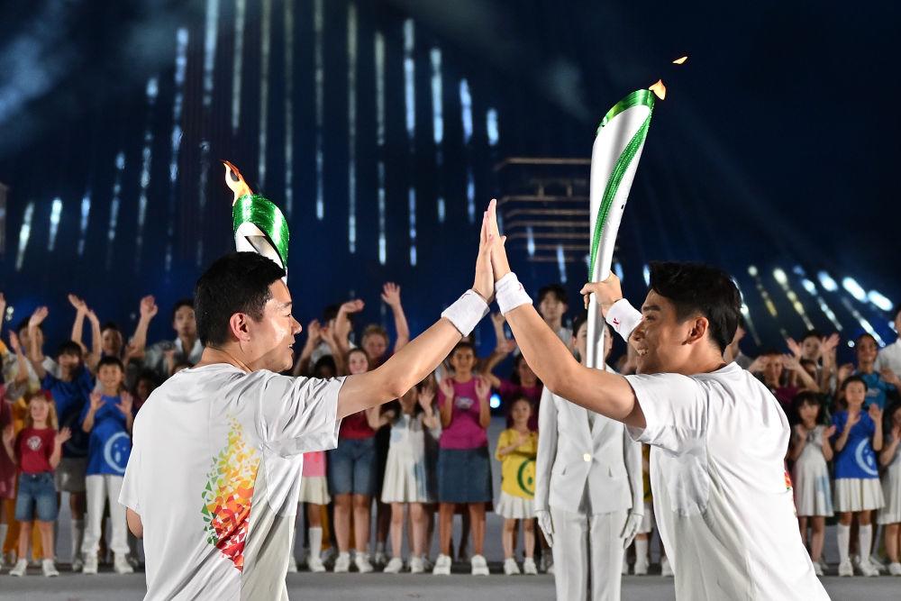 ↑火炬手丁俊晖(左)和董栋在开幕式上传递火炬。 新华社记者 陈振海 摄
