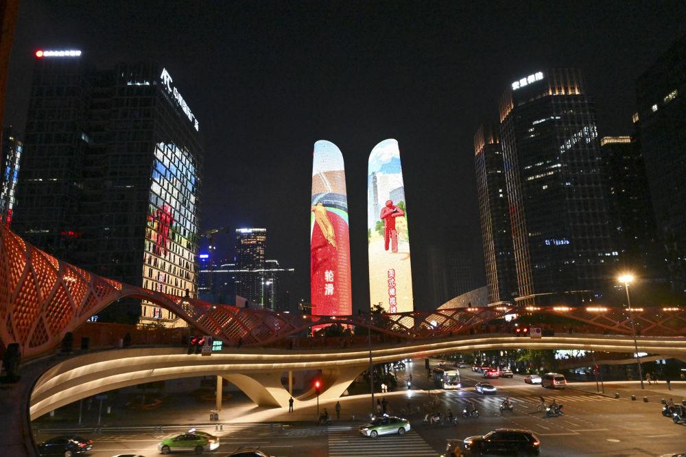 ↑这是8月7日拍摄的成都双子塔灯光秀。新华社记者 杨文斌 摄