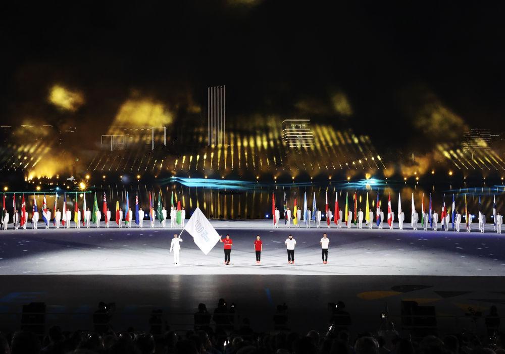 ↑这是开幕式上拍摄的成都世运会组委会会旗、中华人民共和国国旗、国际世界运动会协会会旗、国际奥林匹克委员会会旗(从左至右)。新华社记者 陈诚 摄