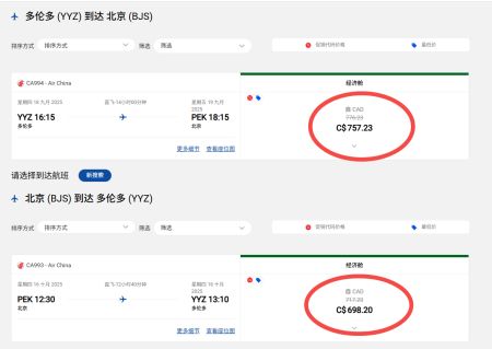 虽然目前国航官网还没有发布消息,但是官网已经开始预定增加航班的机票了,以9月18日星期四为例,多伦多北京直飞往返票价为$1455,这比目前的票价下降了接近一半。