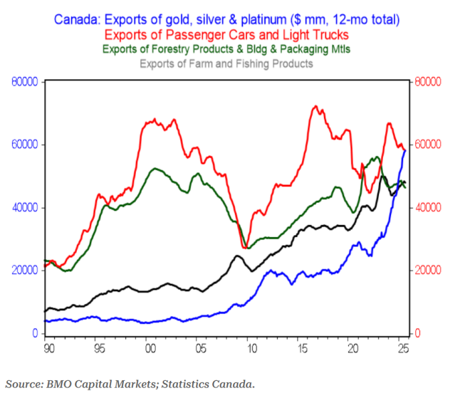 BMO首席经济学家Douglas Porter解释说:“为了说明黄金(及白银)的极端上涨如何改变局势,加拿大这两种贵金属的出口在过去12个月中已与汽车和轻型卡车的出口相当。”他指出,这两类出口额均约为580亿加元。“这意味着在原油之后,黄金即将成为加拿大第二大出口产品——当然前提是近期金价的调整不会演变为暴跌。”