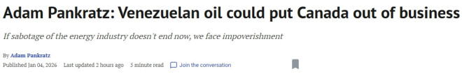 《国家邮报》发表评论员Adam Pankratz的文章,题为”委内瑞拉原油或将把加拿大“挤出局”,文章指出,如果对能源产业的自我破坏现在还不停止,加拿大将面临贫困化的风险。