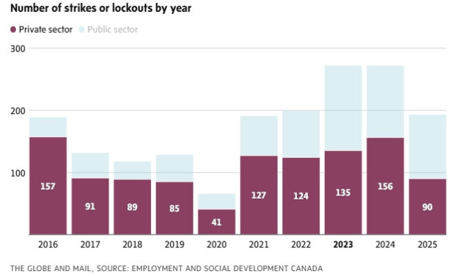 在新冠疫情期间,劳资冲突更为频繁,尤其集中在公共部门。ESDC网站上的最新罢工数据在2025年底才重新向公众开放,而此前该数据曾被该部门无明显解释地移除超过三个月。这次临时下架曾给劳工专家和工会带来困难,使其无法获取研究和政策制定所需的关键信息。