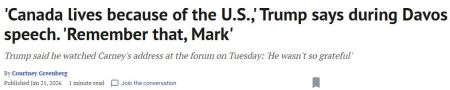 特朗普的这番言论,发生在卡尼于前一天在达沃斯发表重要演讲之后。卡尼在周二的发言中表示,旧有的‘以规则为基础的国际秩序已经终结’,并呼吁中等强国应当勇于点名并制止“霸凌者”和“霸权国家”,尽管卡尼的讲话中并未直接点名任何具体国家,但相关表述引发广泛关注。