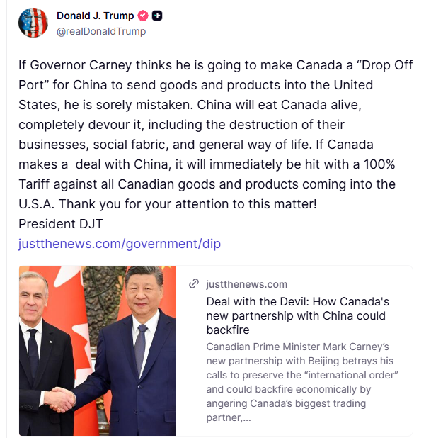 美国总统特朗普周六就加拿大与中国日益扩大的经贸关系发出强烈警告,威胁对所有进入美国的加拿大商品征收100%关税。同时第一次公开称加拿大总理卡尼为“州长”。