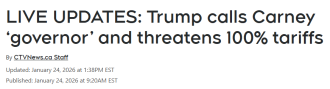 当地时间周六(1 月 24 日),美国总统特朗普再次对加拿大抛出最具针对性的侮辱言论,第一次公开称总理卡尼为“州长(governor)”,并威胁要对加拿大征收100%的关税。这一措辞,与特朗普过去针对前总理杜鲁多反复使用的讽刺性称呼如出一辙,也延续了其多次暗示要把加拿大变成“美国第51个州”的言论。