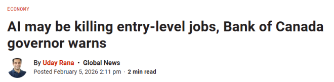 加拿大央行行长蒂夫·麦克勒姆(Tiff Macklem)周四表示,人工智能(AI)的出现,可能正在减少加拿大年轻人能找到的入门级工作数量。