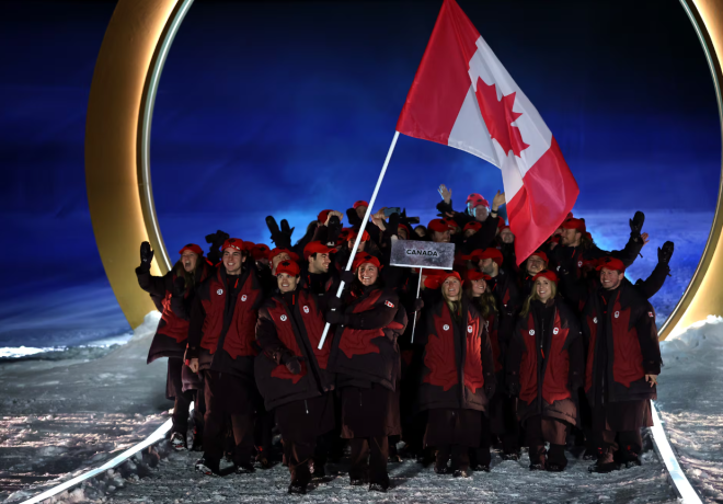 当加拿大代表团入场时,现场爆发出开幕式以来最热烈的欢呼声之一。加拿大队由自由式滑雪名将米凯尔·金斯伯里(Mikaël Kingsbury)和越野滑雪奥运冠军玛丽埃尔·汤普森(Marielle Thompson)担任旗手,约 70 名运动员在看台上大量的欢呼声中走过球场。