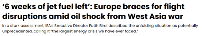 国际能源署(IEA)署长Fatih Birol警告称,由于霍尔木兹海峡的石油、天然气等关键供应受阻,全球正面临“史无前例的能源危机”。更值得警惕的是,Birol周四(4月16日)表示,欧洲目前可能只剩下“大约6周左右”的航空燃油储备,如果局势持续,航班取消“很快就会发生”。