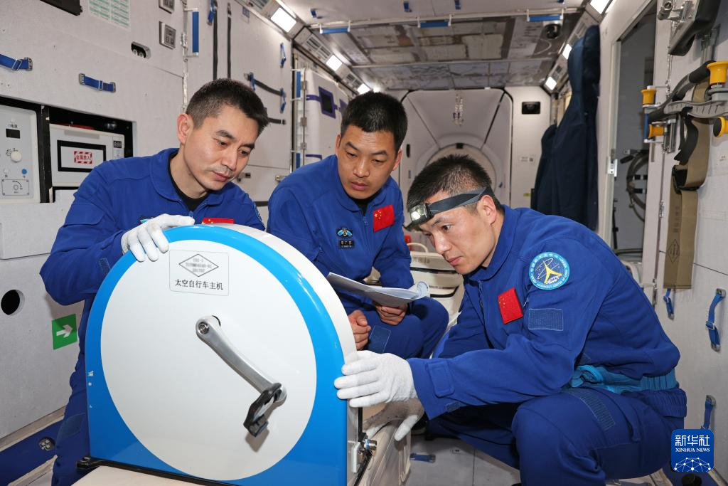 2024年2月18日,神舟十八号航天员乘组在进行太空自行车组装训练。新华社发(徐部 摄)