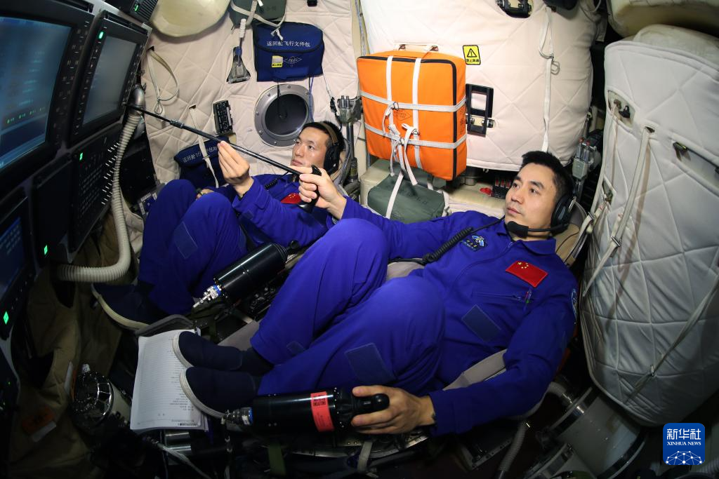 2023年8月22日,神舟十八号航天员乘组在飞船轨道舱训练。新华社发(徐部 摄)