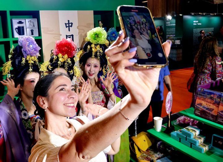 4月30日,一名参观者与唐代仕女妆造的中方参展人员在法国巴黎博览会上合影。(曾宪平 摄)