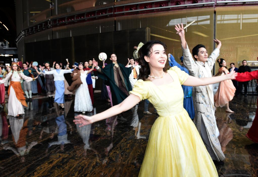 图为演员在国家大剧院公共空间与观众互动。新华社记者 罗晓光 摄