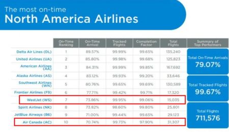 通常情况下,加拿大航空在对北美主要航空公司进行评级的OTP名单中排名垫底。此前的一份报告显示,2023年12月的31,307趟航班中约有30%延误抵达目的地,这使得这家加拿大最大的航空公司排名第十。