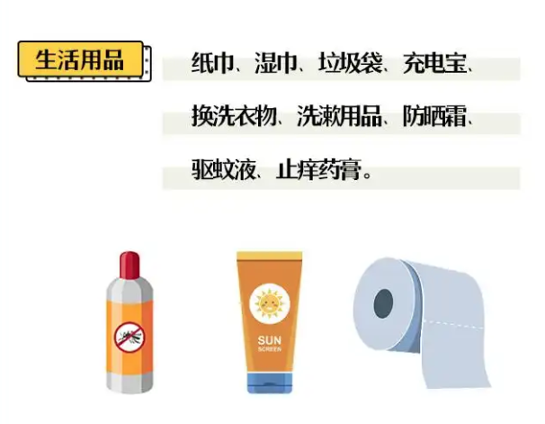 还要带好充足的水和食物、雨伞、打火机、手电筒、户外电源、防晒用品、水袋(壶)、急救包(碘伏、纱布、创可贴、驱蚊液等)。