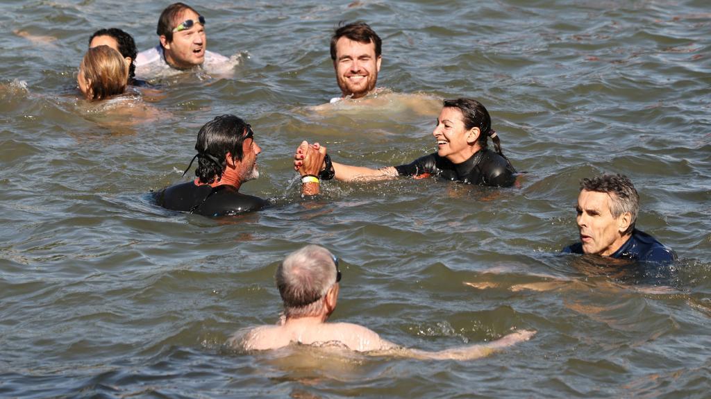 2024年7月17日,巴黎市长伊达尔戈(中右)在塞纳河中游泳,向外界展示几年来的河水净化成效。新华社记者高静摄