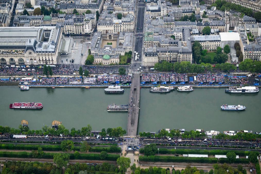 2024年7月26日,第33届夏季奥林匹克运动会开幕式在法国巴黎举行。这是从直升机视角拍摄的塞纳河。新华社发(POOL照片/利昂内尔·博纳旺蒂尔)