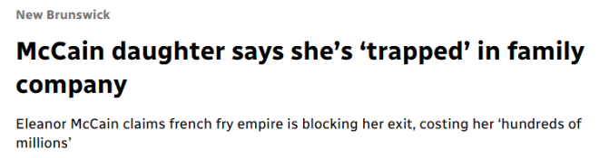 加拿大“薯条帝国”成了一个巨大牢笼,将“公主”困在其中...据 CBC 2026年4月10日报道,麦凯恩食品(McCain Foods)创始人之一Wallace McCain的女儿、知名歌手埃莉诺·麦凯恩(Eleanor McCain)近日将家族控股公司告上法庭,称其自身在家族企业股权中“如同被困牢笼”,难以自由脱身。