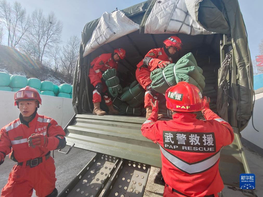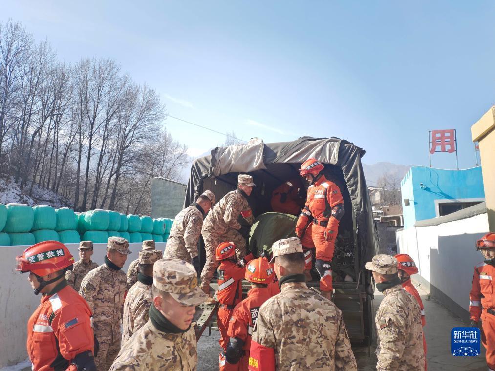 12月20日,武警甘肃总队机动支队官兵在积石山县刘集乡崔家村搬运救灾被褥。新华社发 (安鹏飞 摄)