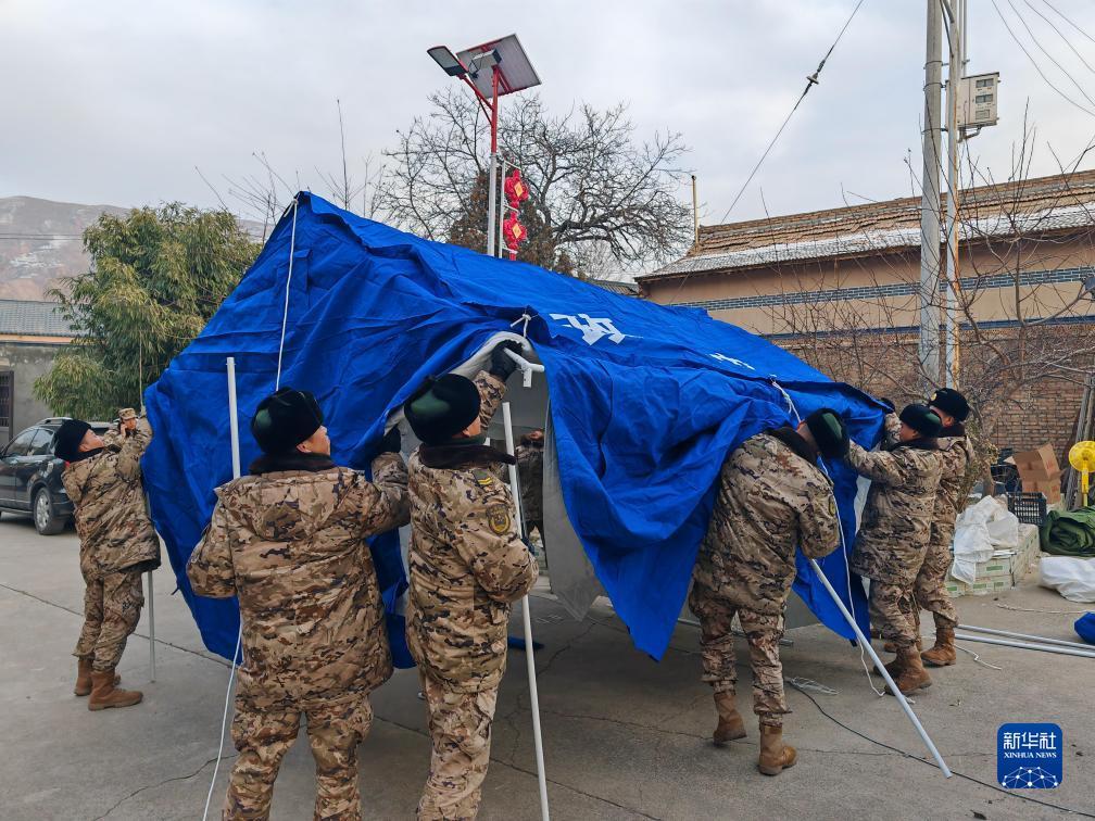 12月20日,武警甘肃总队临夏支队官兵在积石山县刘集乡高李村搭建帐篷。新华社发(王祎伟 摄)