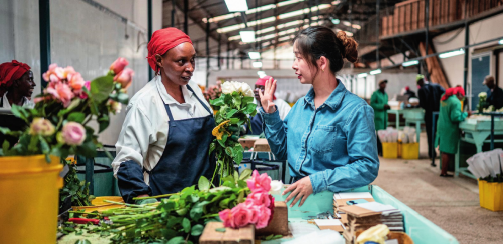 湖南玺悦国际贸易有限公司负责人黄梓楠(右)在肯尼亚纳纽基的坦布济花卉农场挑选鲜花(2024年5月18日摄)王冠森摄/本刊